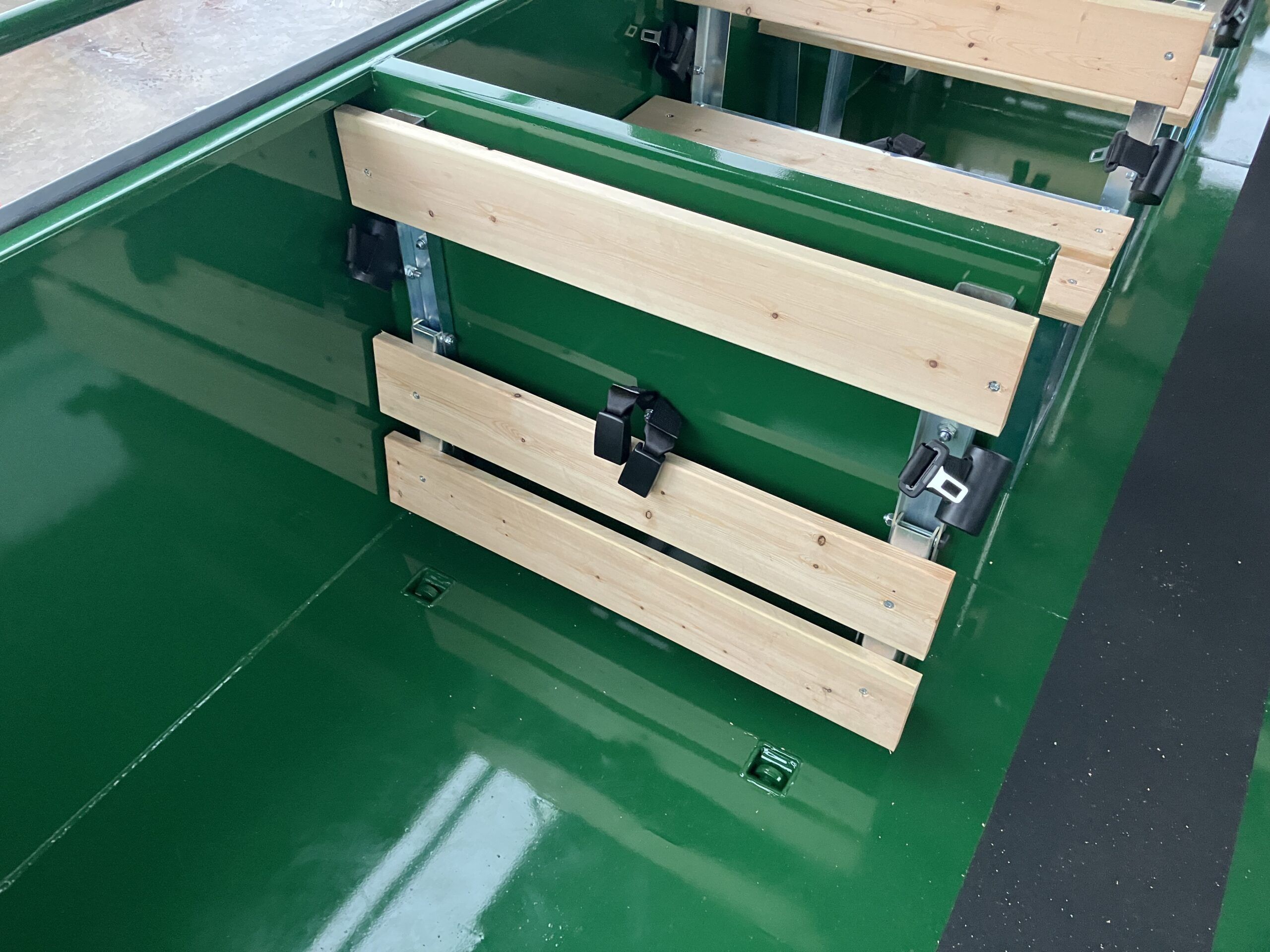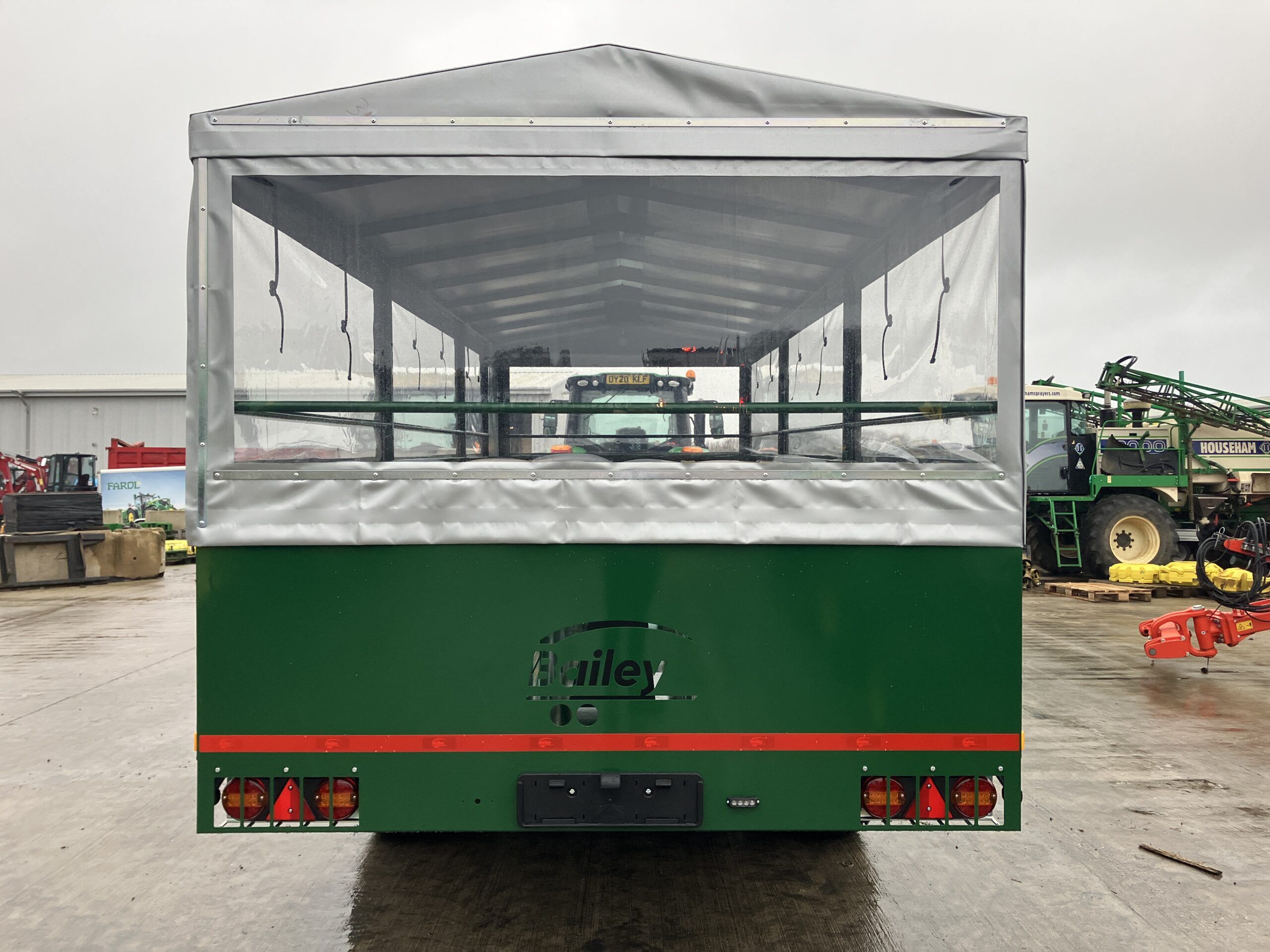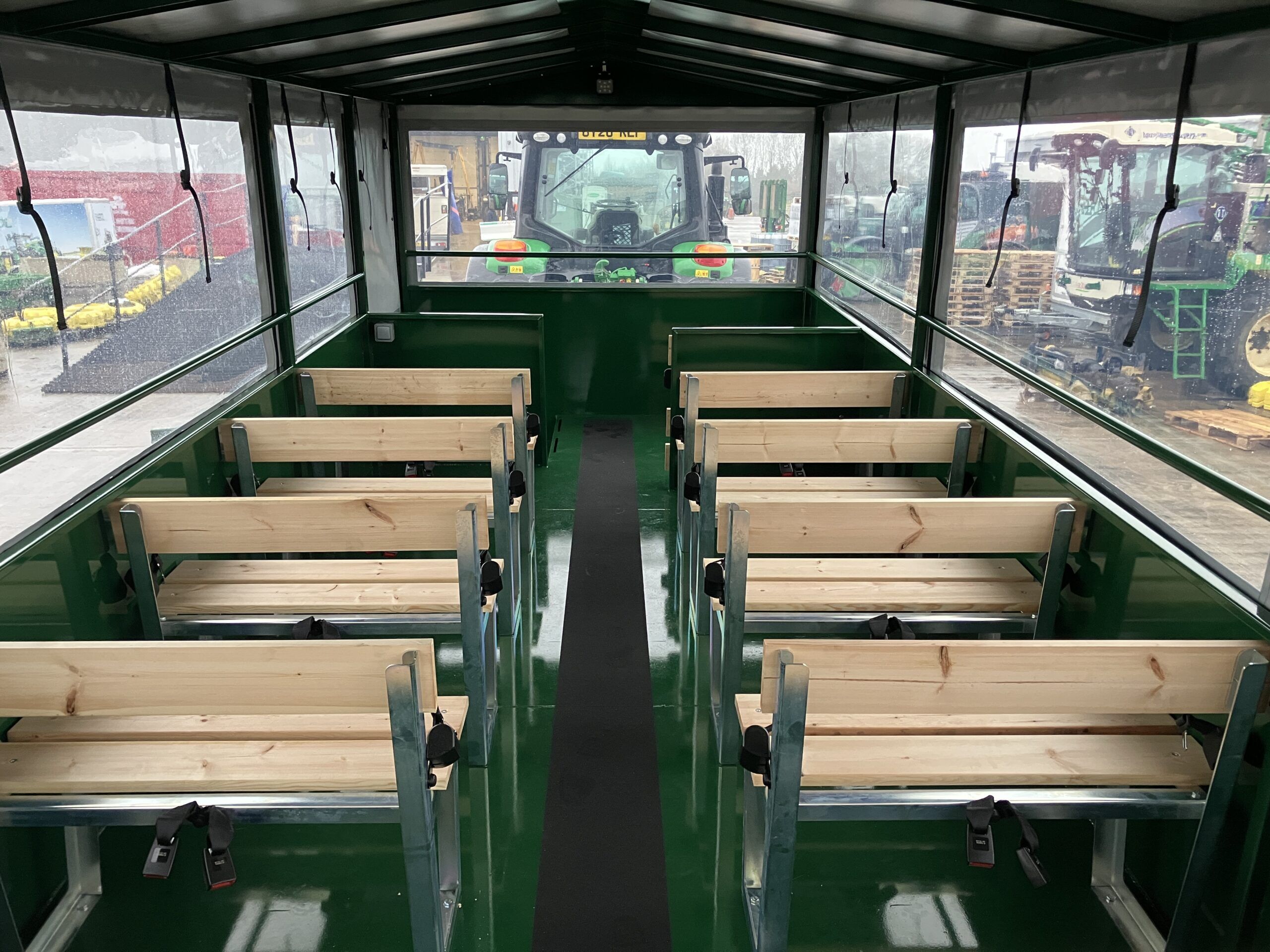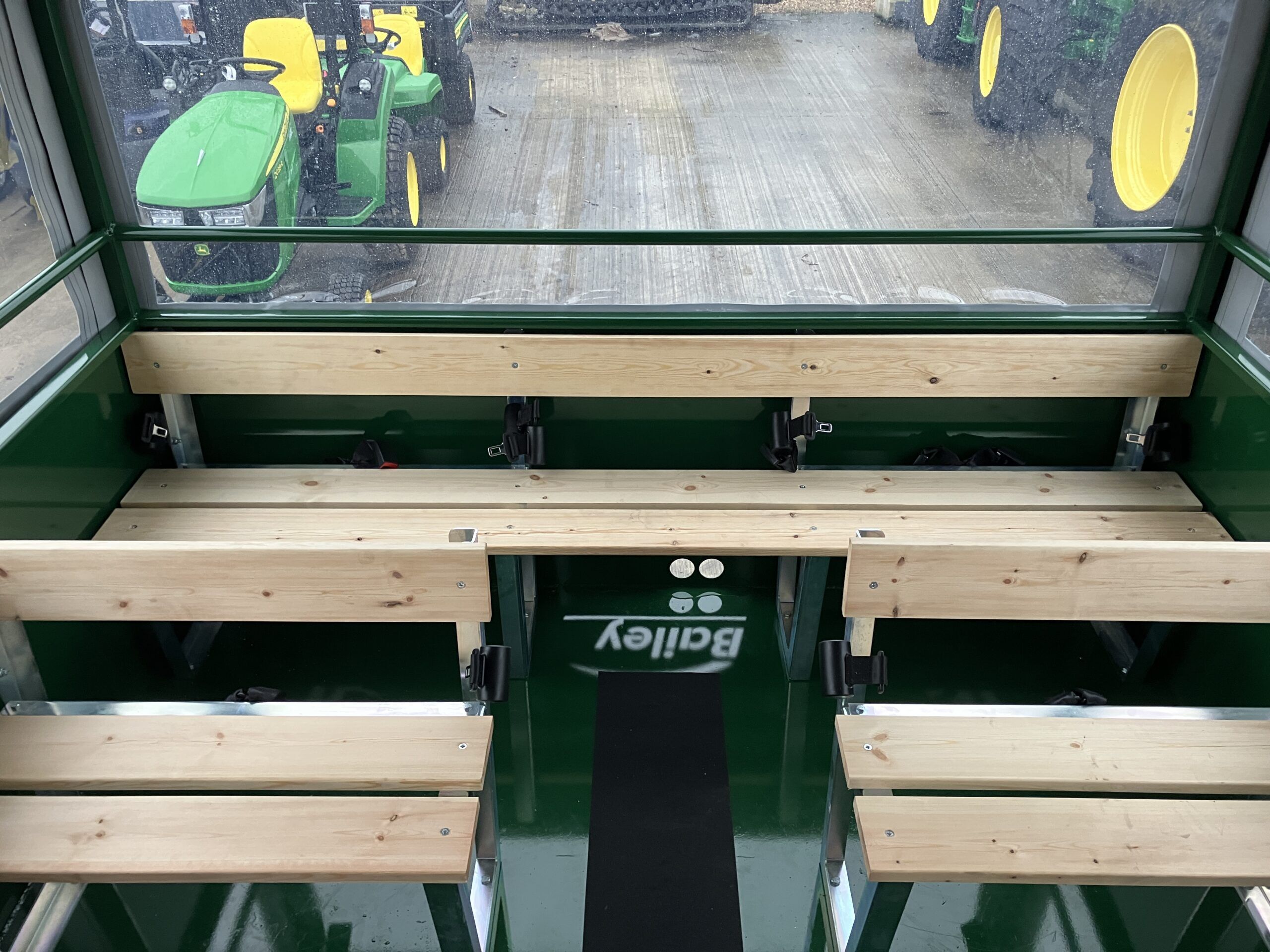 New Bailey Trailers People Carriers, 6 Tonne weight capacity, 400/60X15.5 BKT wheels and tyres, standard (Non sprung) drawbar, Bailey Green, 31 seats, Canvas roof and sides, High visibility strips, internal light, front mud flaps, reversing lights and seatbelts, hyd trailer brakes.