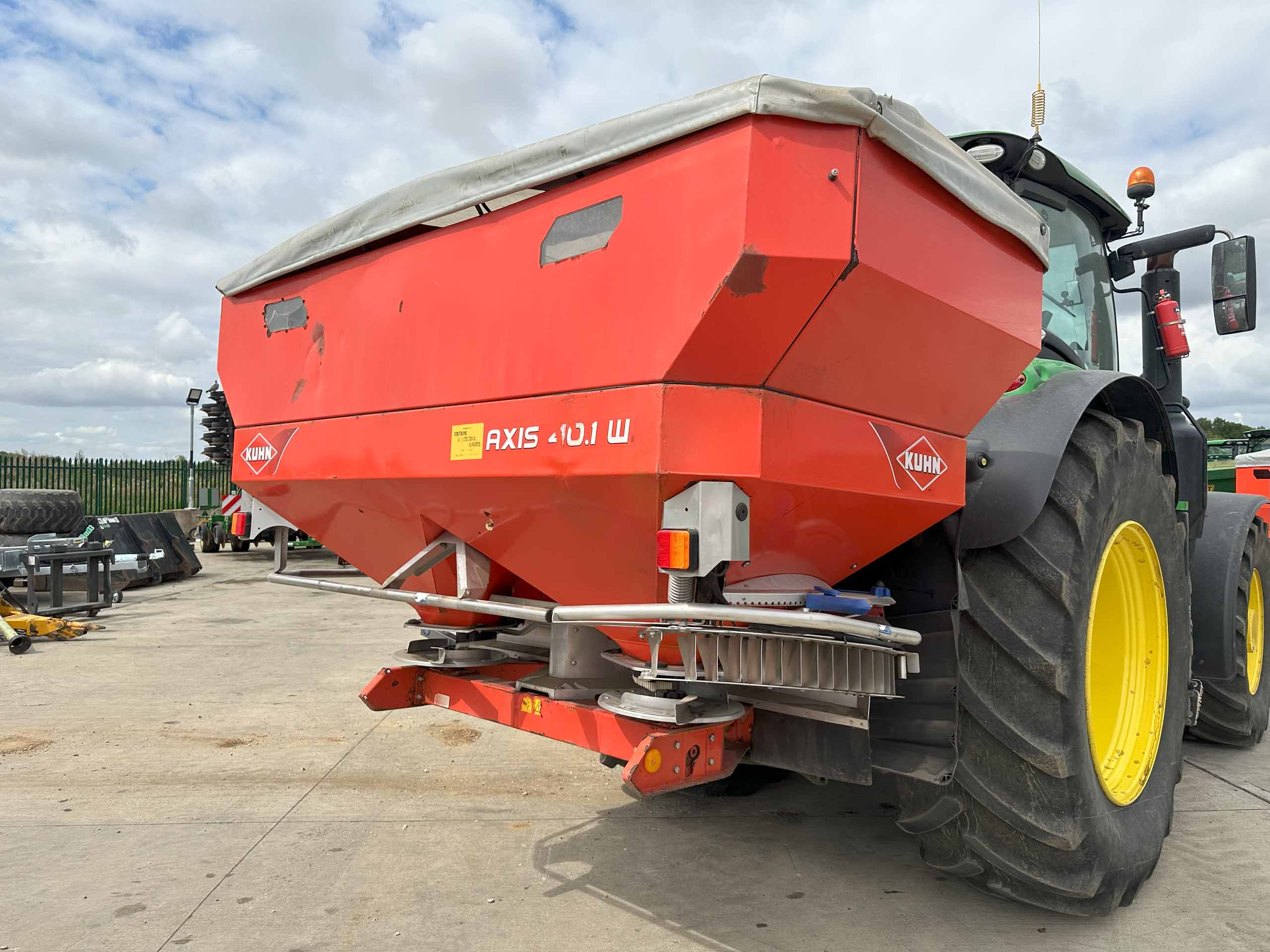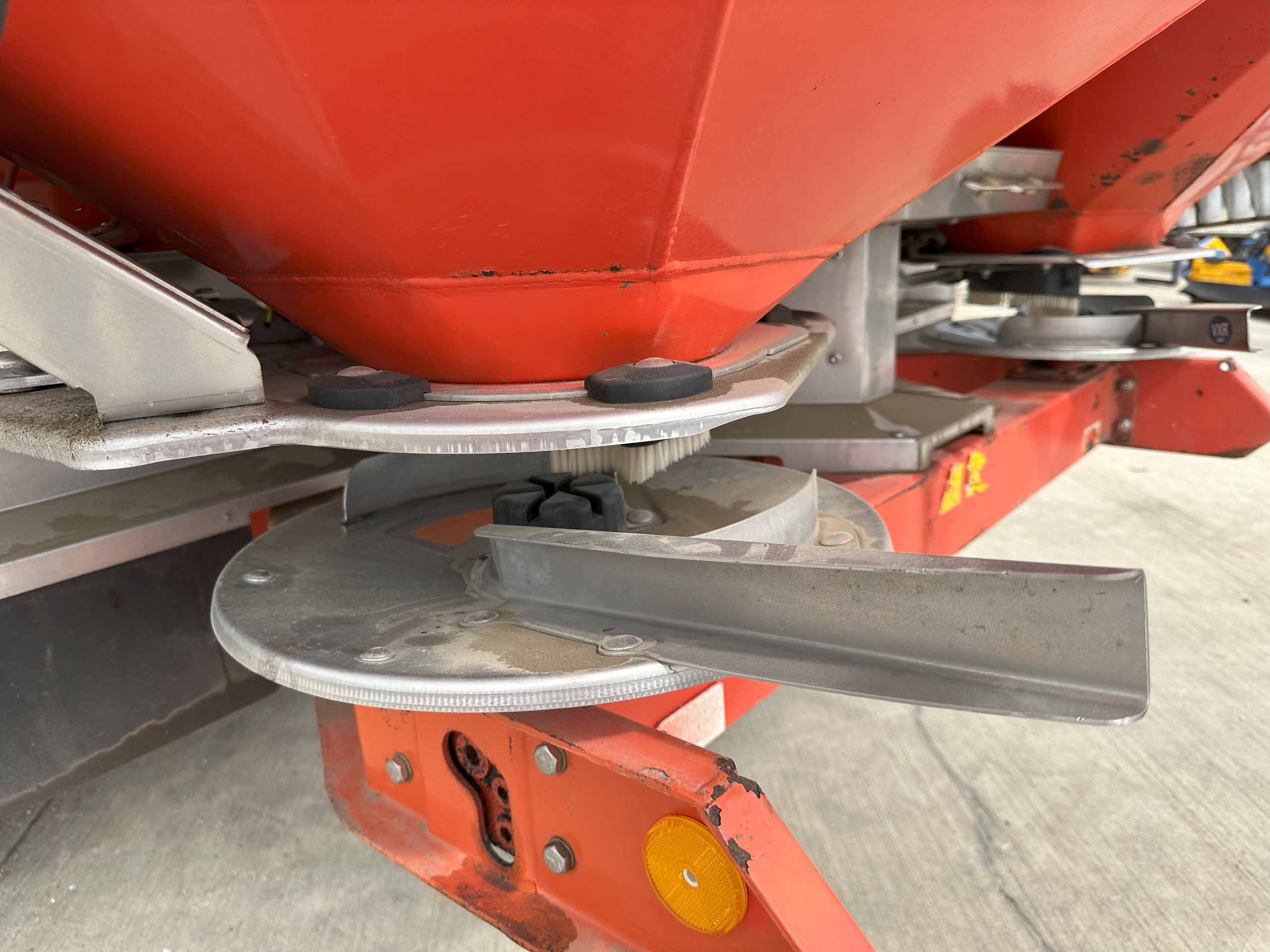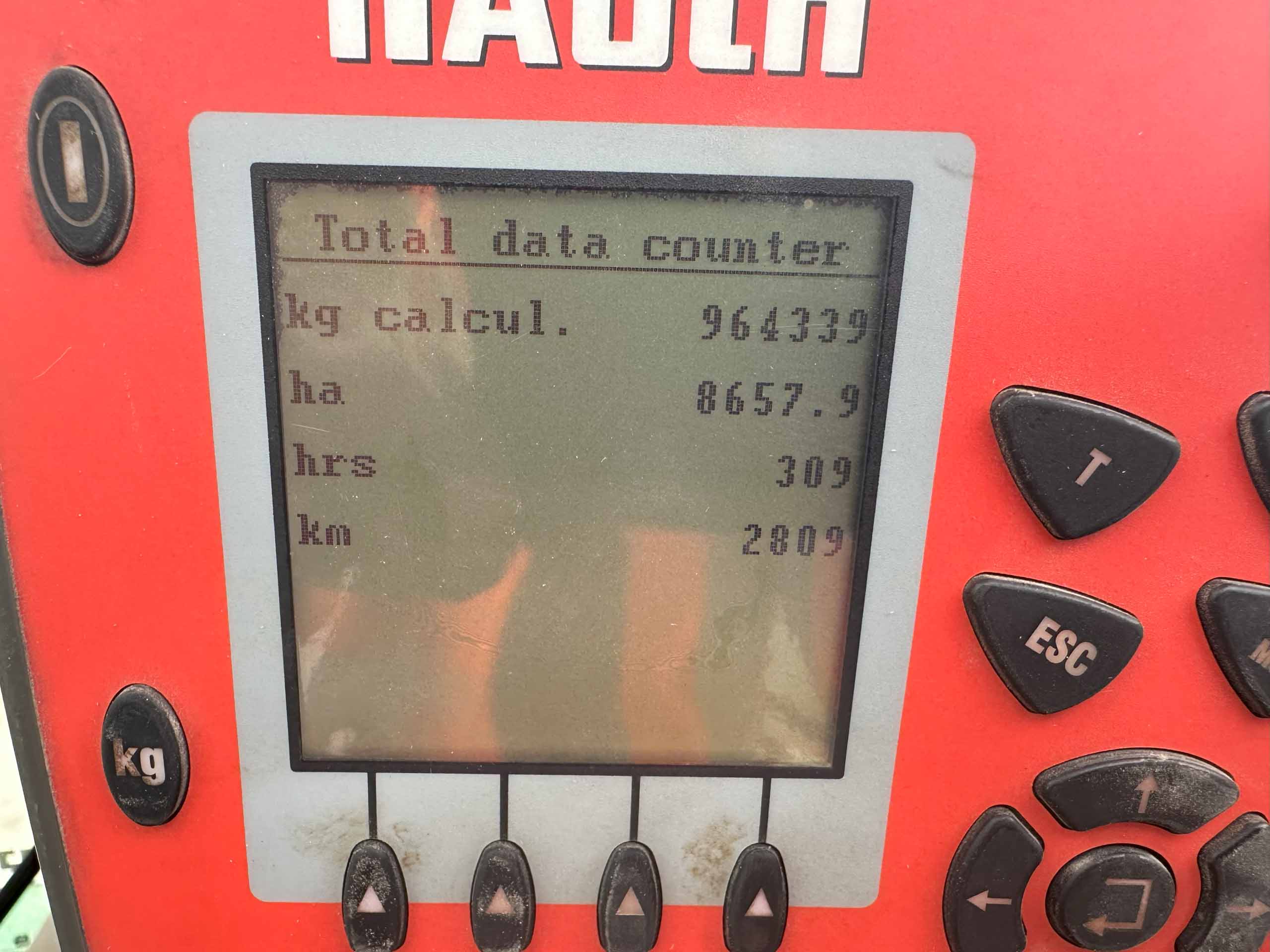 2009 fertiliser spreader, S8 discs, 30-36 metres spreading width, weigh cells, pto drive, 8657 hectares, hopper cover, road lights. Dent on the back.