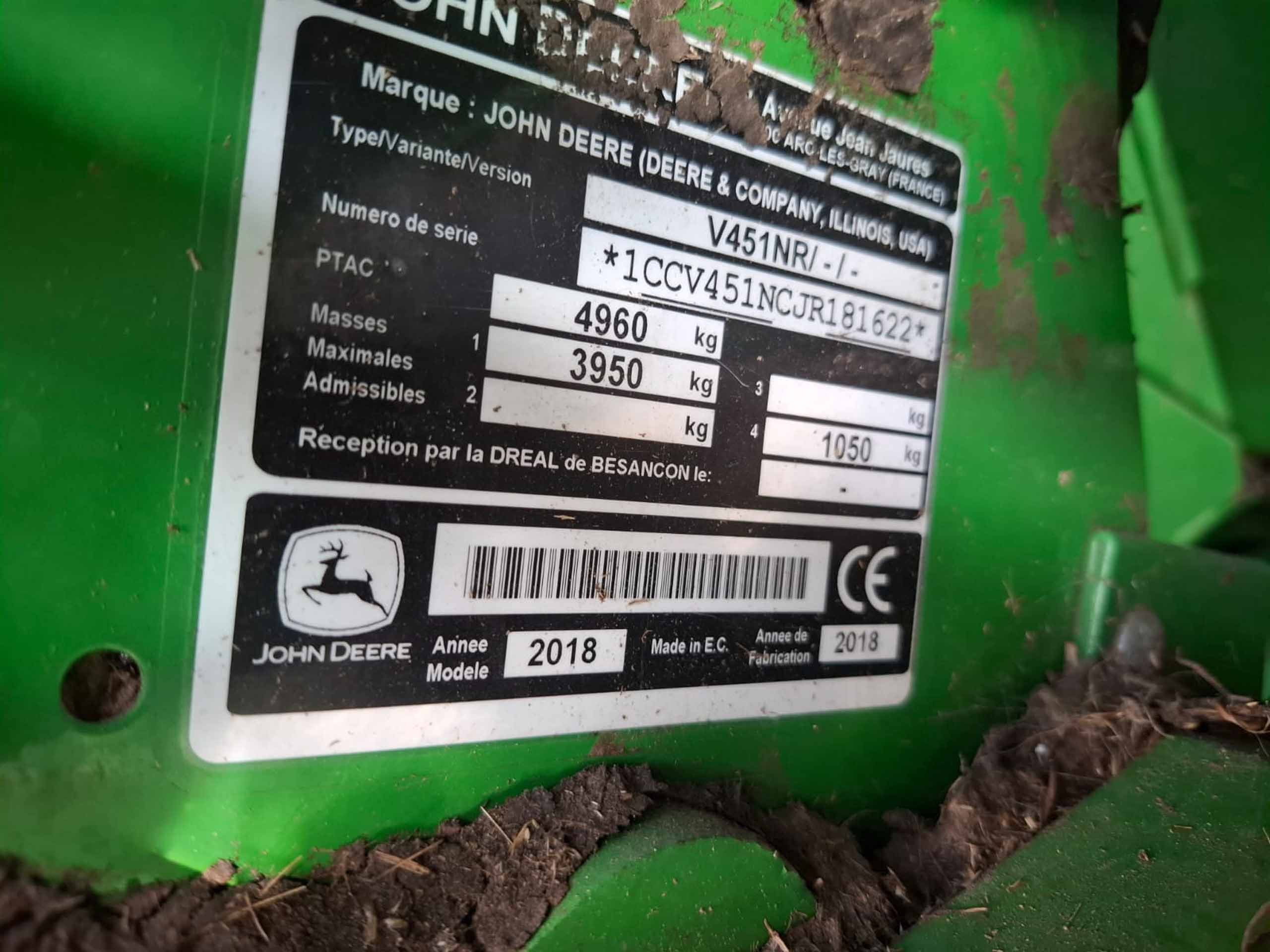 2018, John Deere Variable Round V451R Baler, 5ft chamber, Rotoflow HC Premium, ISOBUS, fixed gauge wheels, 500/50-20 wheels and tyres.