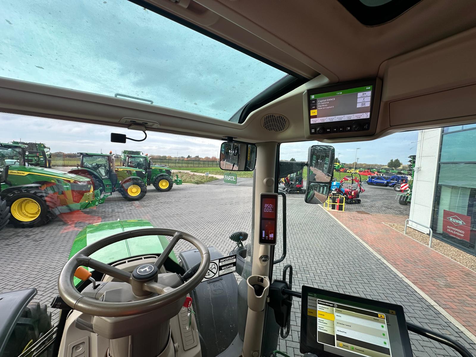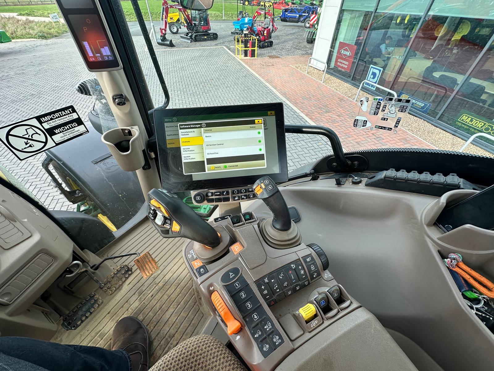 Ex Hire, 2024, 1225hrs, AutoPowr CommandPro, 50K, AutoTrac Ready, G5 Screen, App radio, TLS, HCS, Premium air seat, A/C, 4ESCV with electric joystick controls, 155L/min hyd pump, additional hyd oil reservoir, Hyd IPM, power beyond prep - rear, compressed air supply socket, rear fender controls, roof hatch, mid mount, Panorama glass roof, air/hyd brakes, Ultimate LED Light package, Michelin 540/65R30 650/65R42, Road Registered: 19/03/2025, January 2024 Build, has had 750hr service, 900kg front weight not included. **Compressive PG Warranty: 21/03/2027 - 3000hrs, Ex Hire John Deere Subsidised Finance, 1+2 Annuals based on 60% of selling price @1.5% flat p.a, UK Customers only, T&C's Apply, NEW John Deere 643R loader in stock which can be fitted additionally to this tractor please call to discuss**