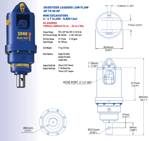 Auger Torque 3000MAX auger drive unit with hydraulic hoses Suitable for 2-4 ton machines, requires 27-75 lpm auxiliary flow, 959-2,877nm of torque To be used with S4 augers from 100mm to 600mm (4" to 24"), 65mm round shaft