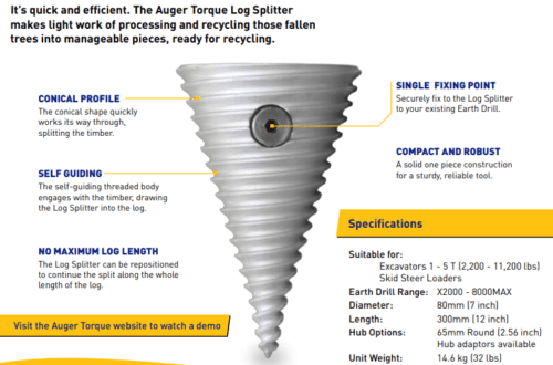 Auger Torque log splitter with 75mm square hub To suit 1-5 ton machines, Earth Drill Range: X2000 - 8000MAX, Diameter: 80mm (7 inch) Length: 300mm (12 inch) Hub Options: 75mm Square (2.56 inch) Hub adaptors available