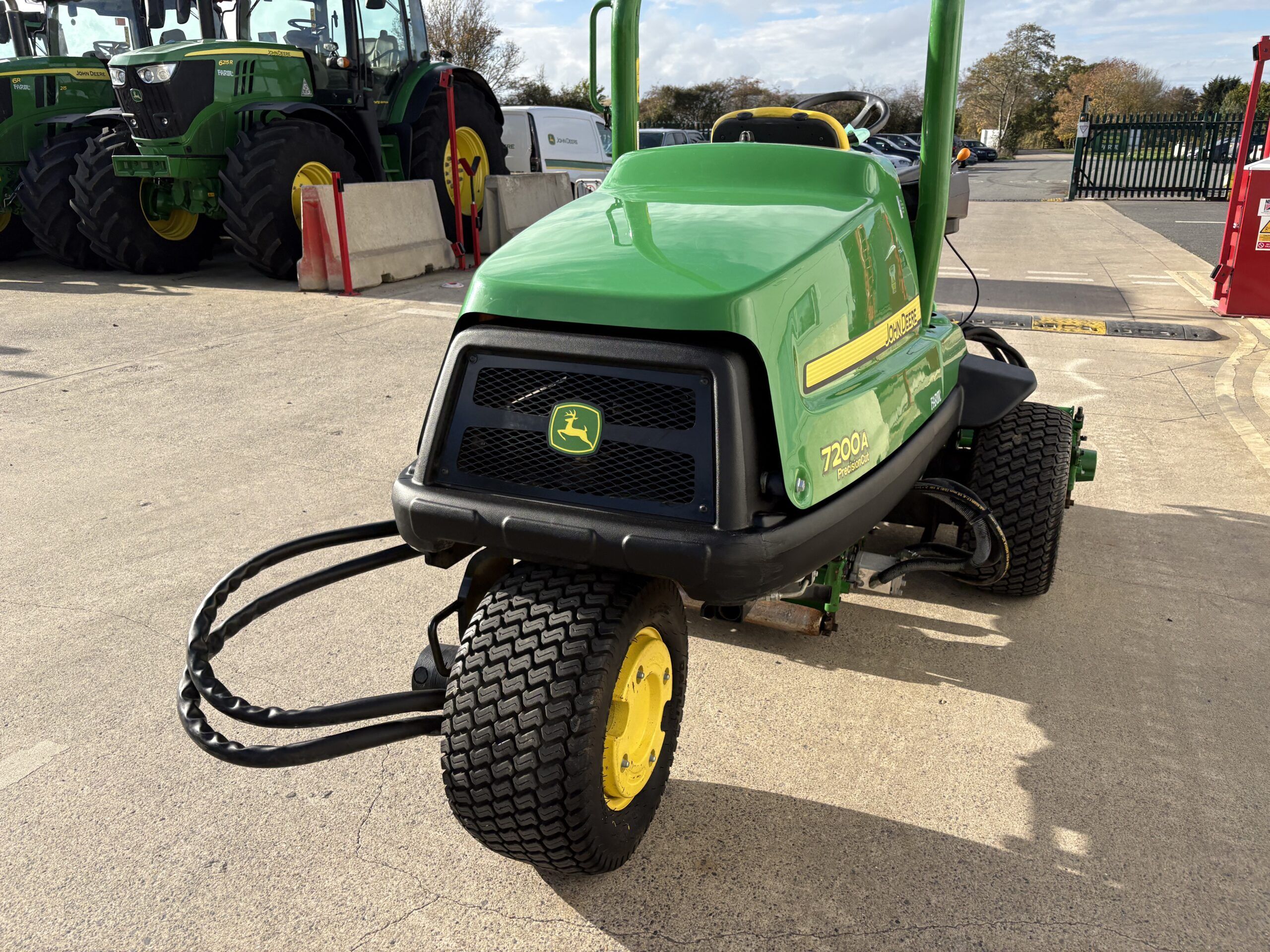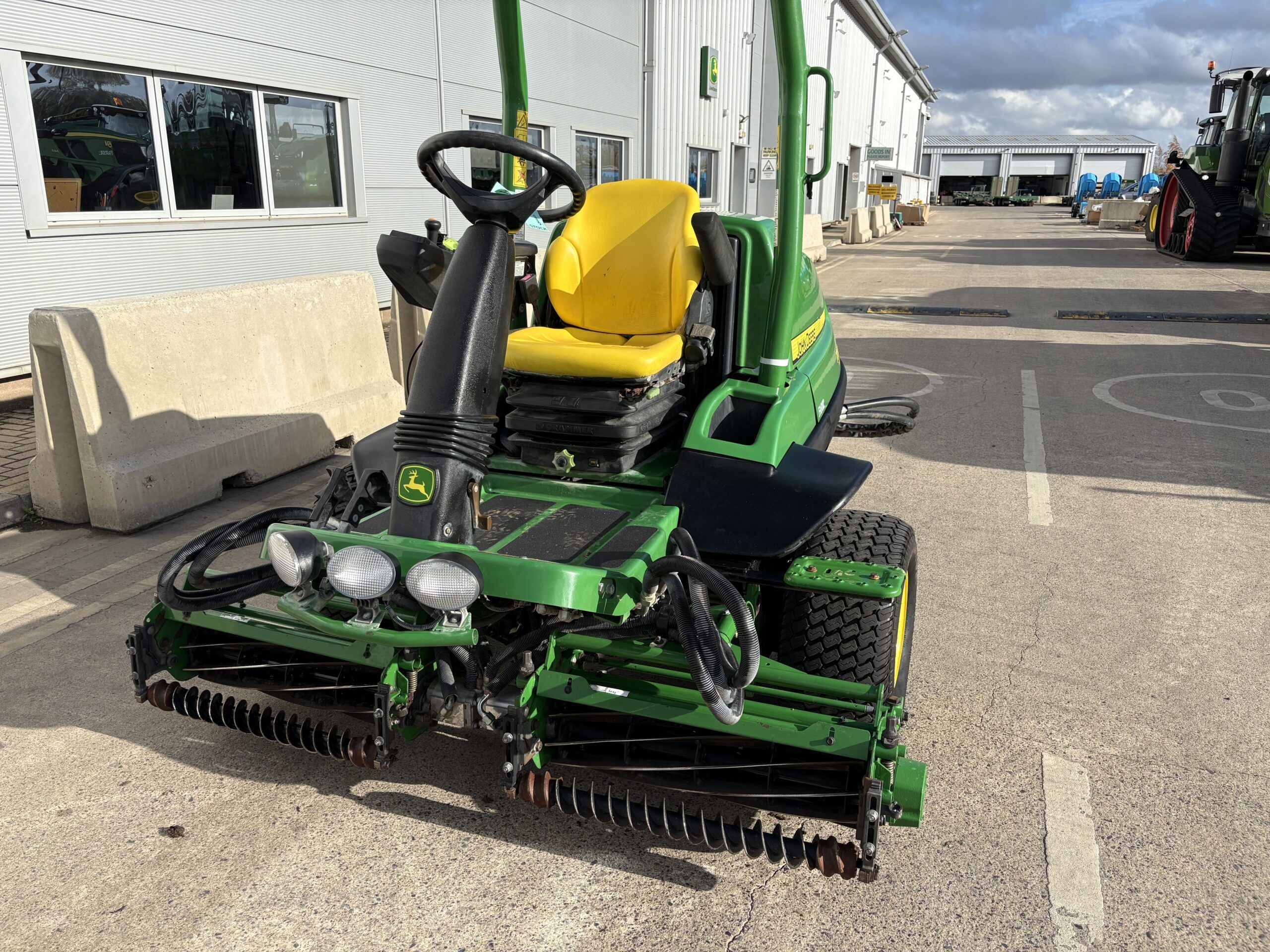 Tees, surrounds and ornamental lawns triple cylinder/reel mower. with Control Passcode-protected TechControl display enables quickly setting or changing mowing speed, turning speed, or transport speed to limit variations in performance by different operators. 21.2hp 3cylinder diesel engine, QA7 units with 8 blade cylinder/reels, spiral front rollers, GRIP all-wheel drive traction system, width of cut 68"-72", ability to put either L/H or R/H front unit further out by 14" from the tyre wall for edging but keeping the power unit as far away as possible from eg a bunker edge, flower border.